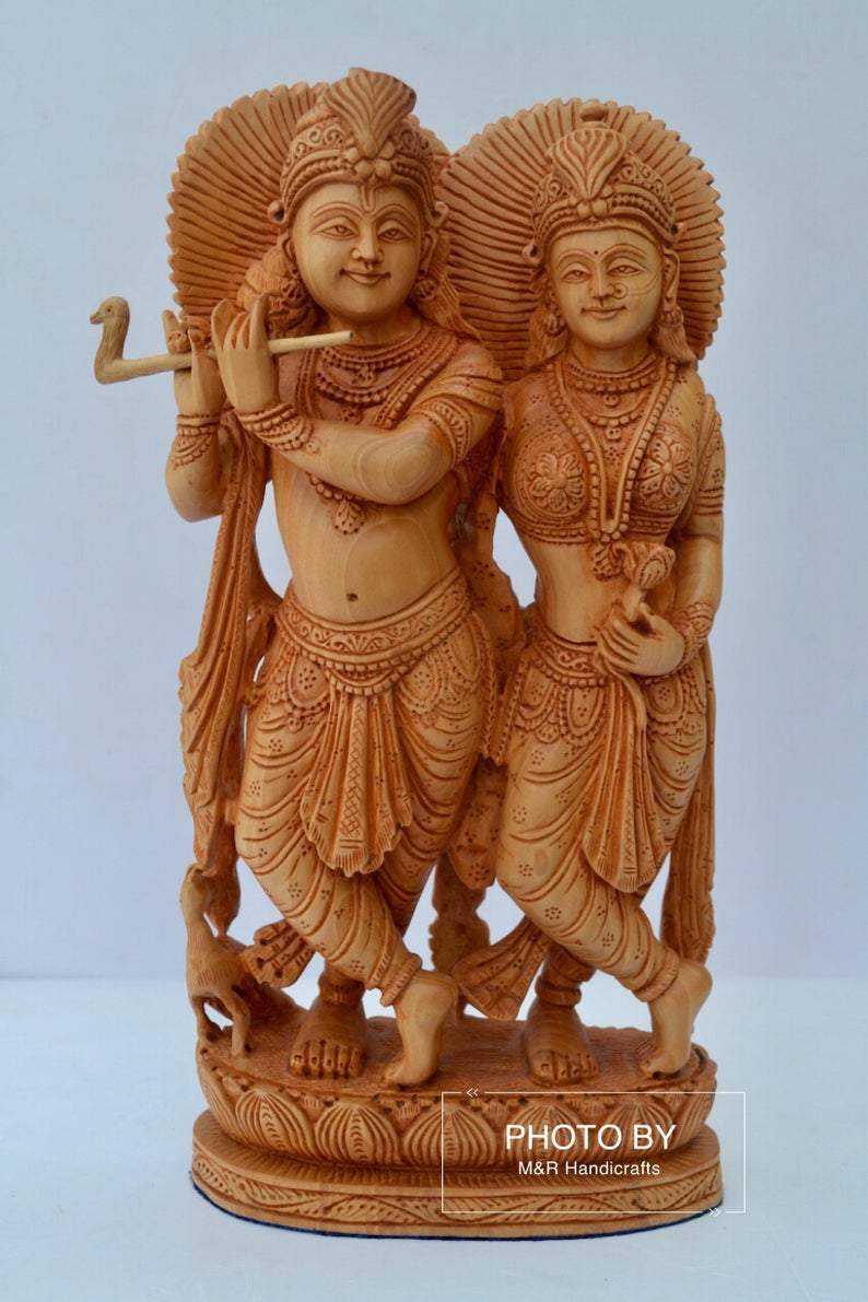 This beautiful hand carved figurine is carved from one piece of kadam wood and depicts story of Goddess Radha and God Krishna in Hinduism .