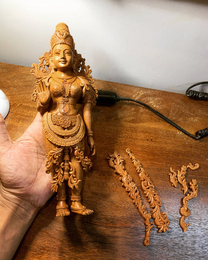 This Lakshmi sculpture is sandalwood handcrafted by the Sandalwood artisan Mohit Jangid. Rare and very older artwork, The sculpture pictured is the only sculpture Malji Arts has like this in our collection.