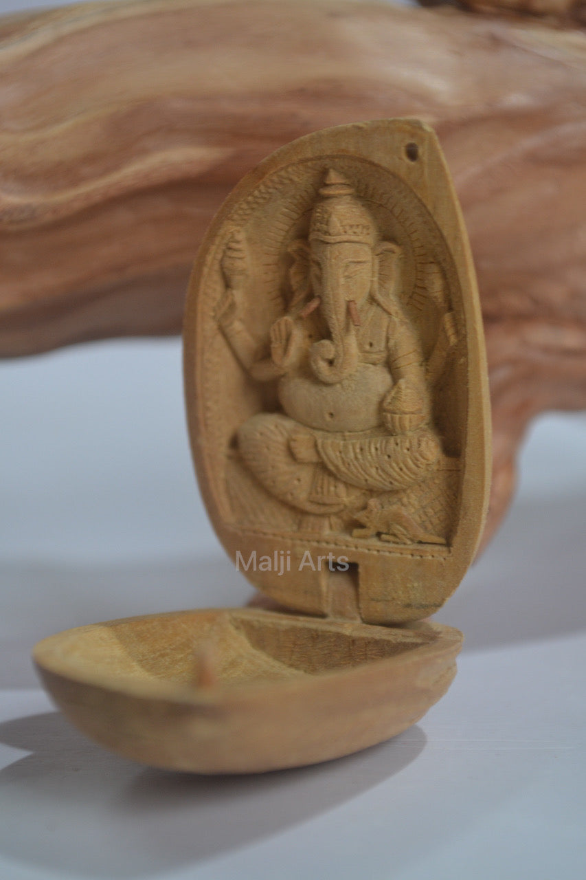 Imbued with the spirit of courage and devotion, this miniature carving features the figure of Ganesha inside an almond with the finest details. On a scale of fewer than Two inches, this brilliant piece has been carved in sandalwood by employing a combination of carving methods.