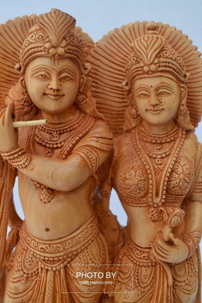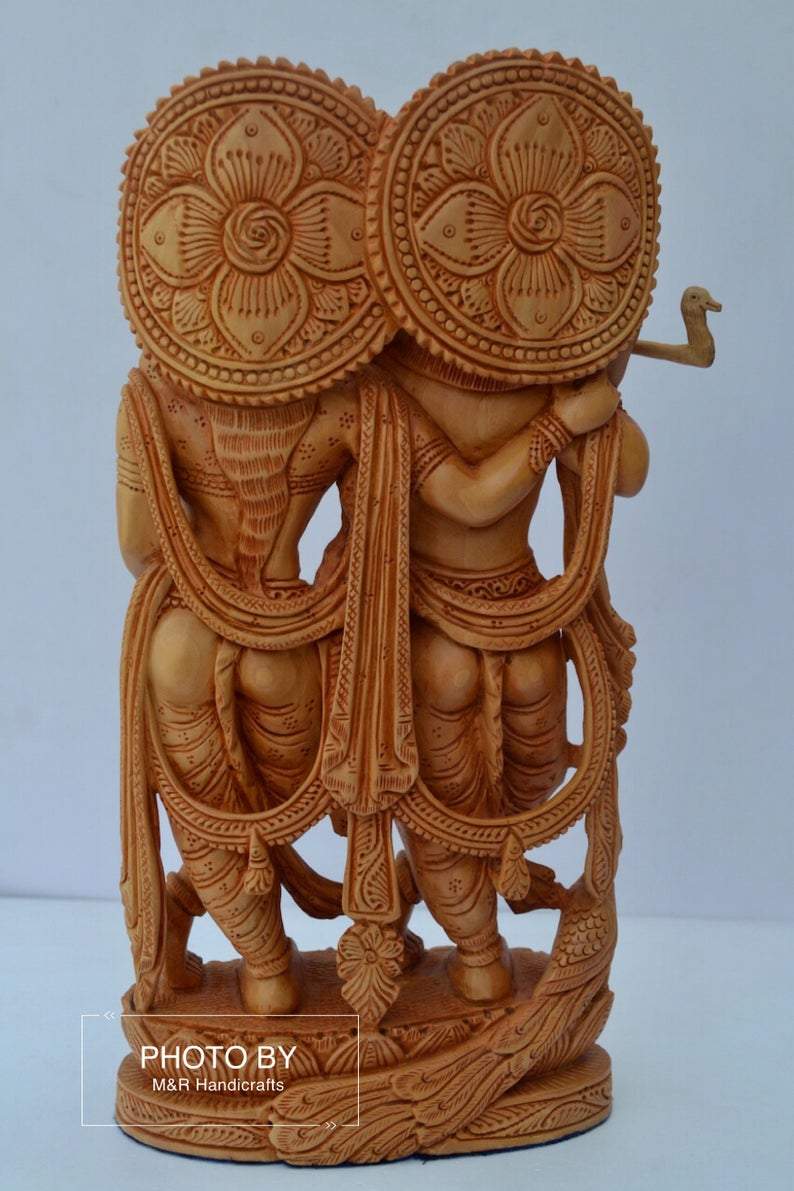 This beautiful hand carved figurine is carved from one piece of kadam wood and depicts story of Goddess Radha and God Krishna in Hinduism .